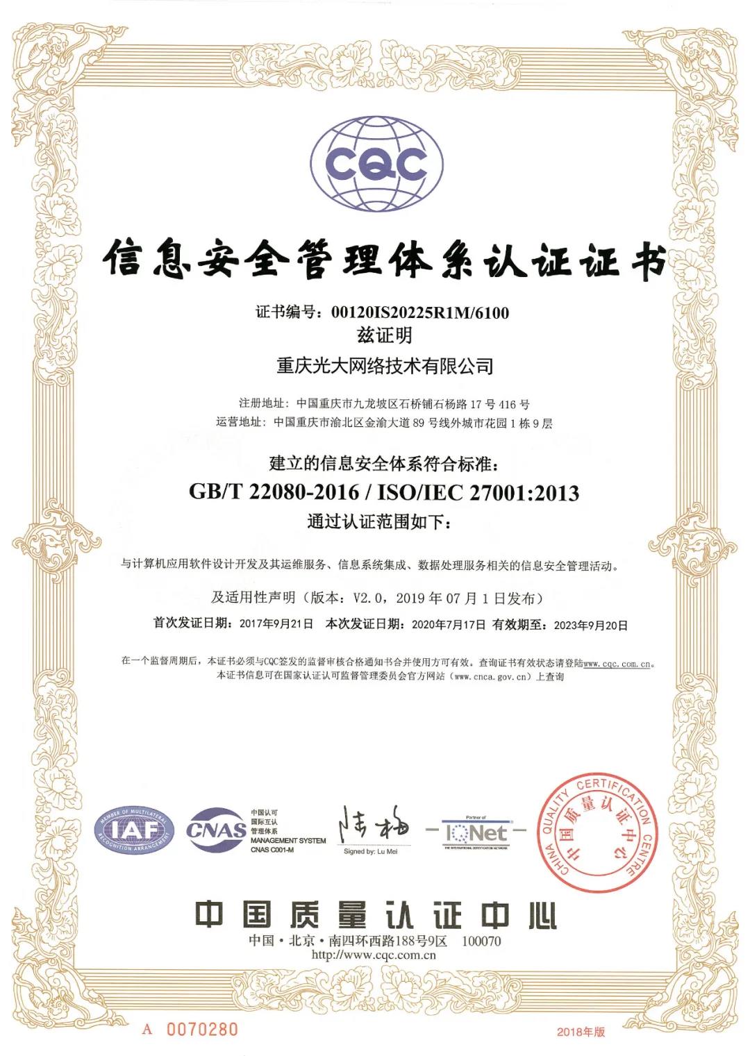(3)GB/T 22080-2016/ ISO/IEC 27001 :2013信息安全體系復(fù)審認(rèn)證成功