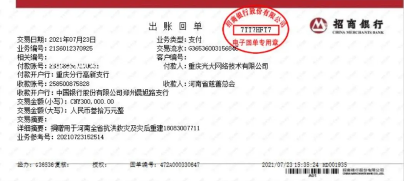 災(zāi)害無情,人間有愛,一方有難,八方支援!河南暴雨牽動著所有光大人的心,光大公司第一時間通過河南省慈善總會捐款30萬元用于河南全省抗洪救災(zāi)及災(zāi)后重建。