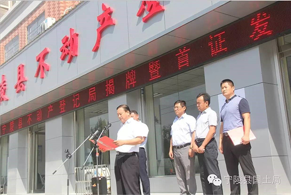 儀式上,縣國土資源局黨組成員、副局長陳建華首先介紹了寧陵縣不動產(chǎn)登記局的建立籌備情況;縣政府黨組成員、副縣級干部馬超同志出席儀式并致辭,與縣委常委、統(tǒng)戰(zhàn)部長朱長軍同志共同為寧陵縣不動產(chǎn)登記局進行揭牌;朱長軍同志還為寧陵錦程置業(yè)發(fā)展有限公司頒發(fā)了首本不動產(chǎn)權(quán)證書。儀式結(jié)束后,與會人員來到不動產(chǎn)登記中心服務(wù)窗口對各項流程進行了詢問了解,同時參觀了不動產(chǎn)登記中心的辦公場所、基礎(chǔ)設(shè)施等。