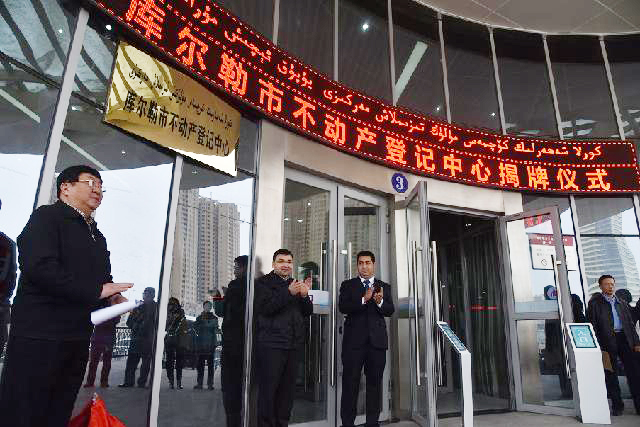 3月18日上午,庫爾勒市不動產(chǎn)登記中心正式揭牌成立。在揭牌及發(fā)證儀式上,自治區(qū)國土資源廳黨組成員、副廳長艾爾肯 ? 吾守爾、巴州人民政府副州長張東兵共同揭牌,庫爾勒市委常委、常務(wù)副市長唐明軍主持并宣讀不動產(chǎn)登記機(jī)構(gòu)設(shè)置文件,張東兵副州長作重要講話。全疆各地州市國土資源局、巴州國土資源系統(tǒng)、庫爾勒市農(nóng)業(yè)、林業(yè)等相關(guān)部門負(fù)責(zé)人參加了揭牌儀式,并實地參觀了庫爾勒市不動產(chǎn)登記中心。