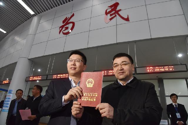 揭牌儀式后,艾爾肯 ? 吾守爾、張東兵、唐明軍分別為庫爾勒市保障性住房投資建設(shè)管理有限公司、夏天、陳新華頒發(fā)全疆第一本、第二本、第三本《不動產(chǎn)權(quán)證書》。